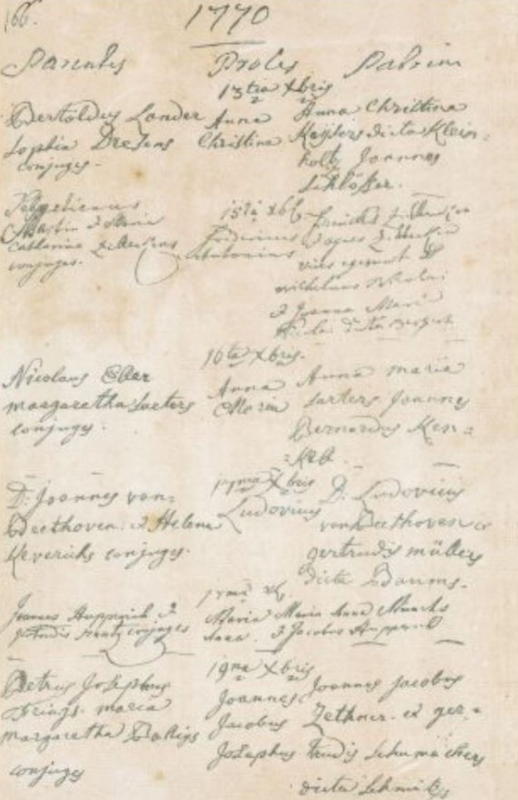 1770年12月16日、ルートヴィヒ・ヴァン・ベートーヴェンは産声を上げた。近くの聖レミギウス教会の洗礼名簿には、1770年12月17日付でヨーハンとマリアとの第二子として記載されている。二人の結婚に強く反対していたと言われる祖父ルートヴィヒは、この第二子の男児の洗礼に名付け親として立ち会っている。 右の写真はベートーヴェンの出生(洗礼)証明書。